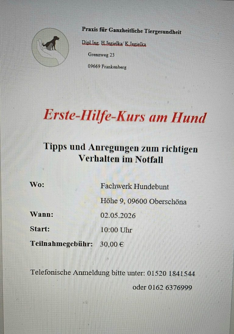 Am 02.05.2026 10 Uhr ist unser erster Erste Hilfe Workshop für Hundehalter auf dem Hundeplatz