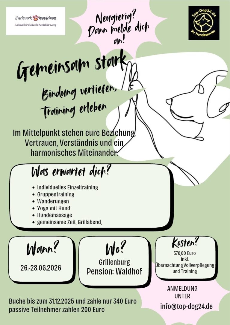 Die soziale Erfahrung in der Hundegruppe, der Austausch mit anderen Mensch-Hund-Teams und die Möglichkeit, Fragen zu stellen, machen jede Tour zu einem kleinen Abenteuer mit Lerneffekt. Natürlich begleiten wir Euch fachkundig und mit einem offenen Ohr für individuelle Themen. Hundetraining im Alltag, draußen und ganz praxisnah – für mehr Sicherheit, Gelassenheit und Bindung auf beiden Seiten.